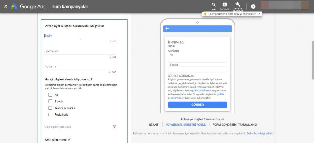 - Potansiyel müşteriler, ilgili reklam uzantısına tıklayarak işletmenin web adresine gitmeden doğrudan başvuru formuna erişebilecek.